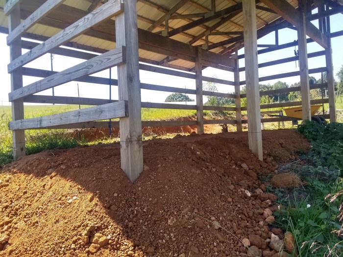 Well, that didn’t work out too well, mostly because there’s no way to get a mini-excavator into the barn to move the dirt around, so the new plan is to have fill dirt delivered – done – and use slave labor (me) to shovel and shift it from a big pile fifty feet away to where it needs to be in the mini-barn.