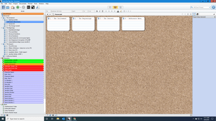 So I took a few minutes to set up Scrivener with the basics of what the outline might look like, adding in some characters and color coding, and here it is.