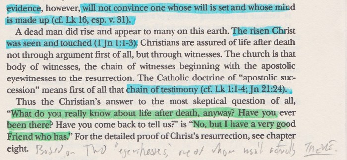 This is the latest development. While going through Kreeft & Tacelli’s Handbook of Christian Apologetics, I found there were three kinds of notes I wanted to take. Firstly, there were biblical citations that I coded blue, there were interesting statements and ideas that I coded in green and then, because I’m not a Christian and I’m totally unconvinced by their arguments I couldn’t help but include snarky comments in pencil, just to remind myself that I wasn’t just passively absorbing their arguments and letting poor argumentation go unchallenged.