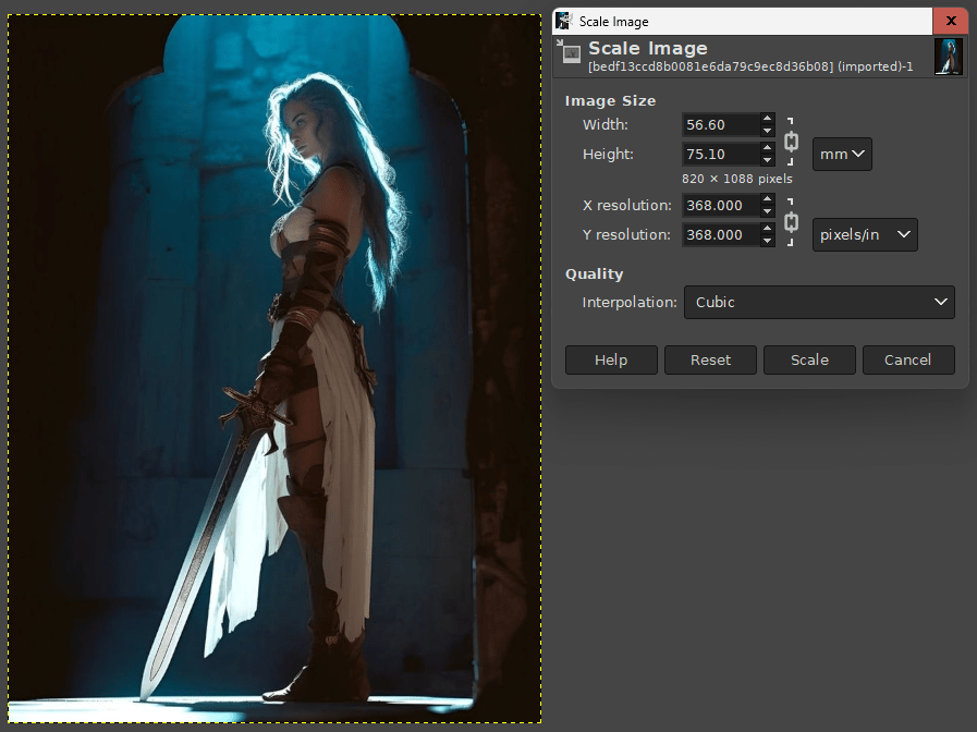 Then I’ll need to adjust the picture. Set the measurements along the Image Size to the system used, in my case mm, and then adjust the X or Y resolution (it doesn’t matter, provided the aspect ratio is locked, because they should change together) so the smallest dimension is appropriately sized. In other words, adjust the image width until one dimension is correct and the other is larger. Adjusting the pixels/in means that we keep the original number of pixels, we’re just putting them in a smaller area, that way we don’t lose resolution.
