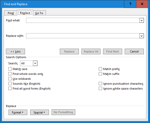 This is the fun part. You’ll need to open the Find and Replace dialog – just press CTRL+H.