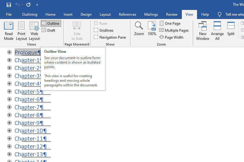 If you’ve followed along, you’ll be able to close up each chapter so all you see is the heading. Here, I have Prologue selected. Just press CTRL+C and it’s copied.