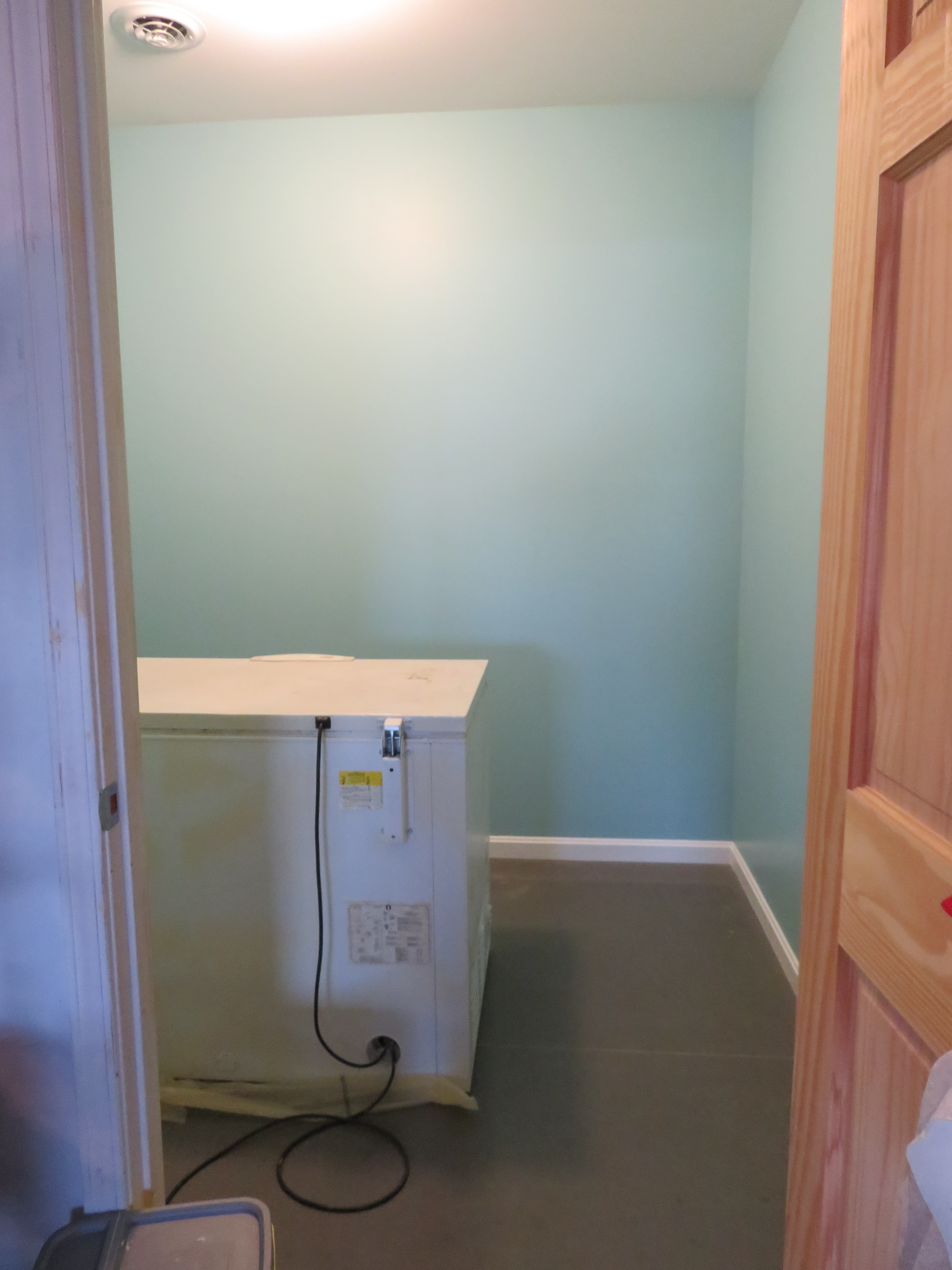 Once everything is out, except the trusty chest freezer which really can’t go anywhere else, there’s plenty of room to install the baseboards and get to work with the filler, sand paper, brushes and cans of light blue paint that the wife chose to adorn the pantry walls.