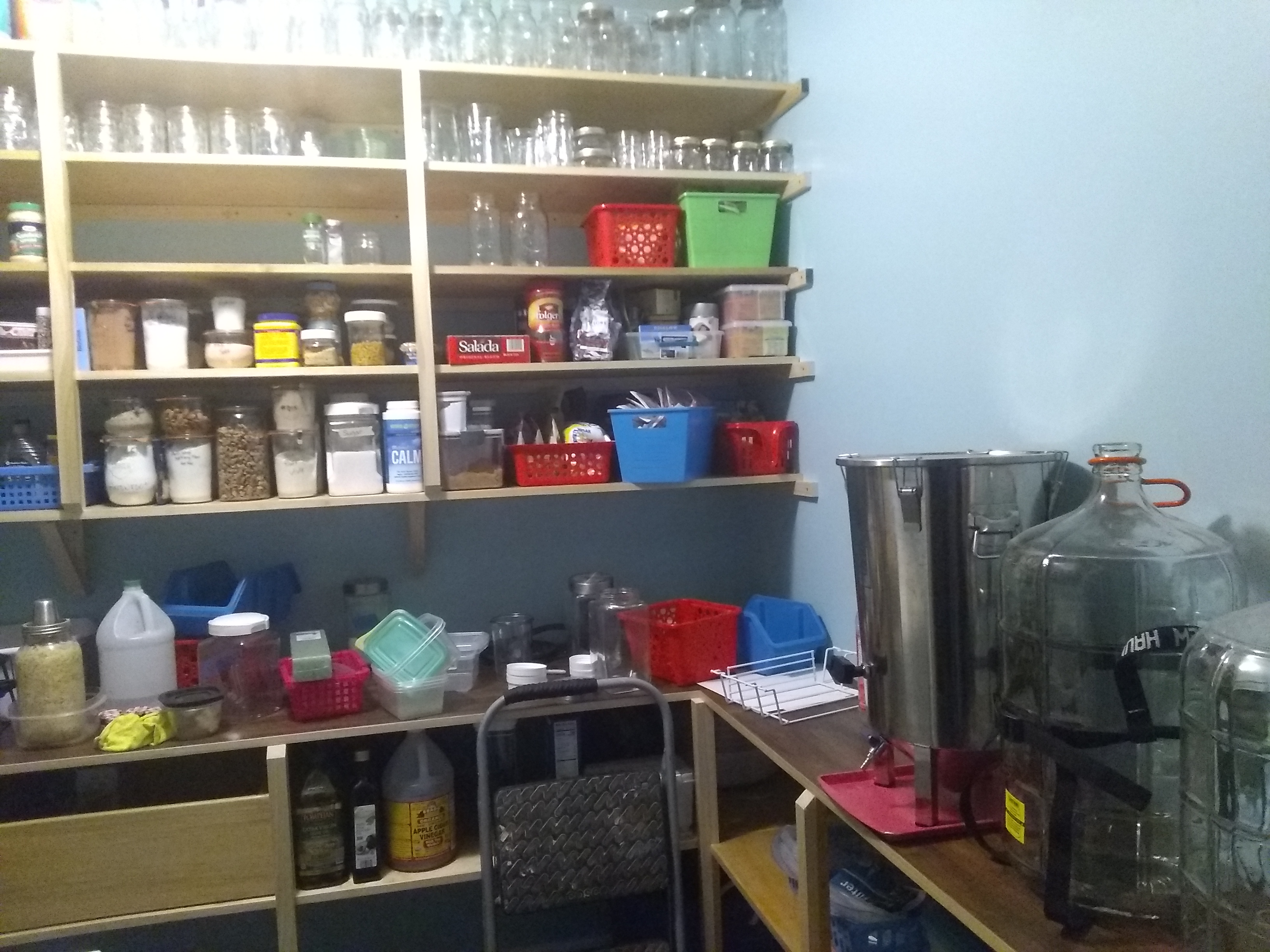 All told, this project took a little over four weeks. One to get the pantry ready, one to get the cleats cut and installed, another to get the shelves cut and installed, one more to get the structural supports fitted, and finally a couple of days to get the walls repaired and the place cleaned up ready to be restocked.